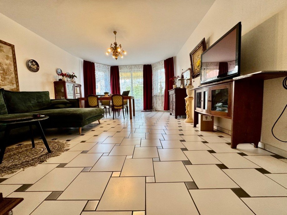 Das Wohnzimmer bildet das Herzstück der Wohnung und bietet direkten Zugang zur großen, sonnigen Terrasse, die durch eine Markise zusätzlichen Komfort bietet, perfekt für entspannte Stunden im Freien.